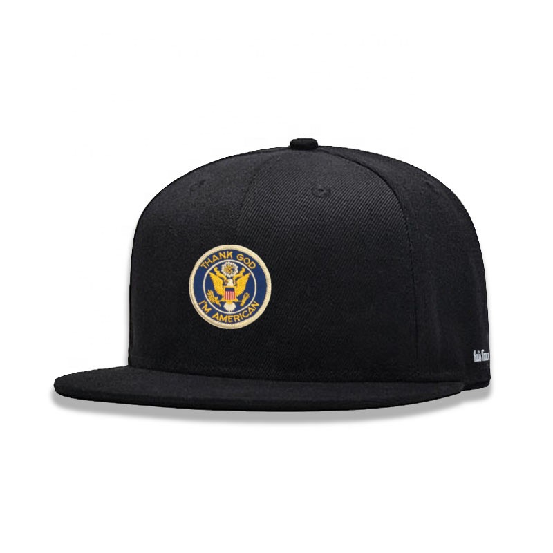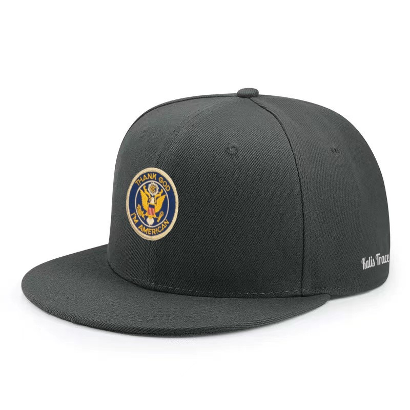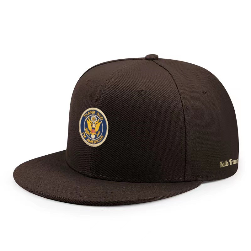 KALIS TRACE GOD-TRUST CAP in blue, marine, black, brown and gray A six panel hip-hop cap with a stiff front peak and embroidered eyelets for ventilation. A patch logo USA God trust Army is located on the front of the cap. The KALIS TRACE signature in rubber on the side. 100% cotton and Polyester.