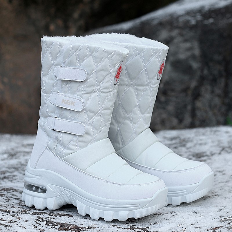 KGK CHALAWAN SNOW BOOTS en blanc et en noir. Bottes de neige ayant une conception rembourré designer avec des losanges partant des chevilles jusqu’aux dessous des mollets, tissé avec une doublure supérieur en peluche. Une doublure intérieur tissé avec de la laine de coton. Une ouverture sur le côté extérieur, ayant trois scratch, dont un avec la signature KGK caoutchouté. Un patche logo KGK rond, tissé sur l’avant de la botte. Un rembourrage verticale tissé sur l’avant de la chaussure. Une large bande en cuir tissé sur le tendon de la botte. Des semelles supérieur tissé avec une conception en cuir. Une étiquette tissé avec la signature logo KGK à l’intérieur de la semelle. Des semelles intermédiaire en éthylène vinyle acétate, et des semelles extérieur plate en polyuréthane. Des bulles d’air dans la semelle extérieur.